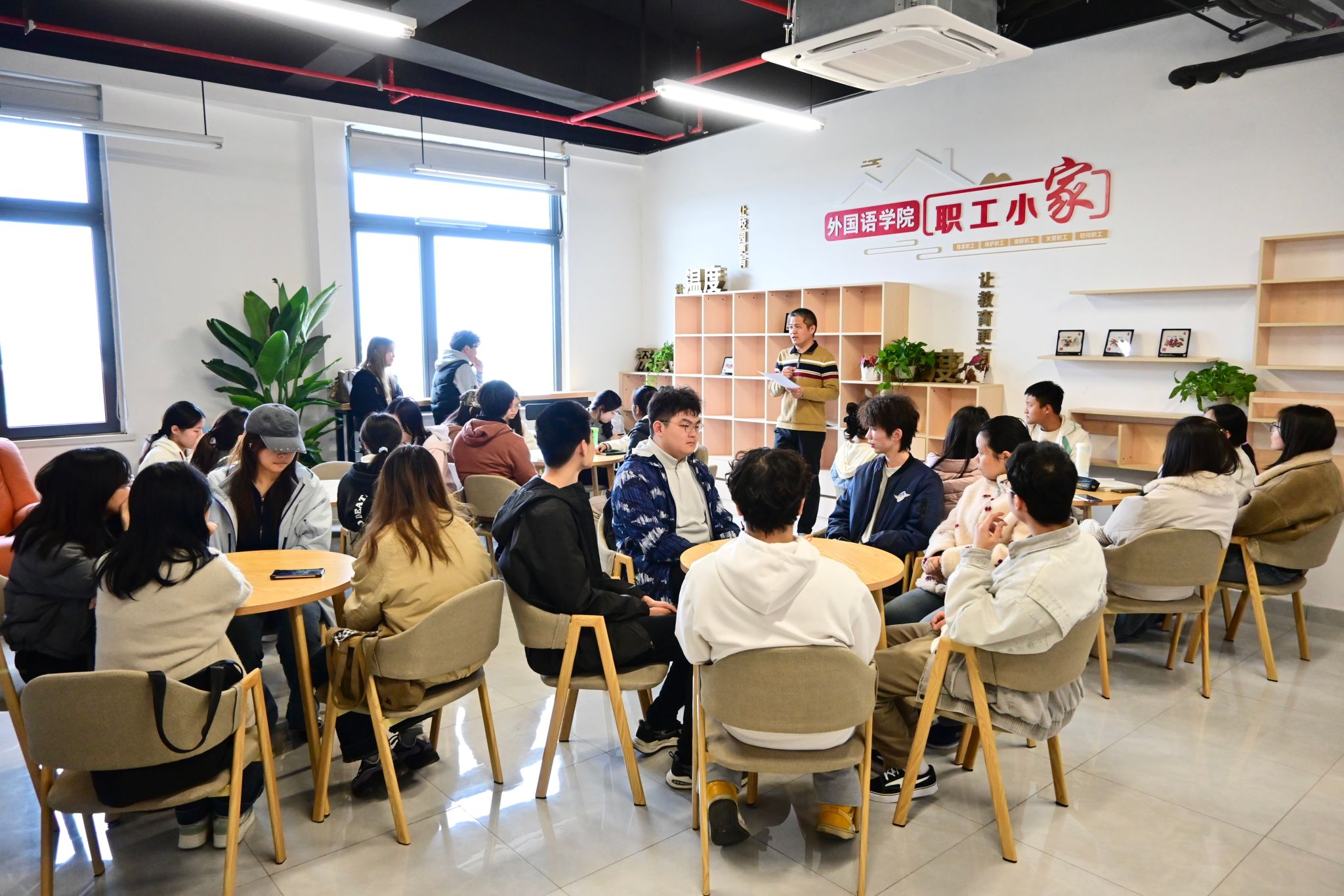 本网讯 外国语学院叶奇奇摄影/报道 3月18日,扶摇书院·外国语学院一站式学生社区第七期“相约周三·师生交流会”在学院职工之家成功举办。本次特邀学院王杭老师(王杭老师曾担任中国驻宋卡总领馆领事、中国驻美国使馆一等秘书)以“从‘教书育人’到‘外交为民’”为主题给在场学子带来一场兼具思想高度与实践温度的成长分享。