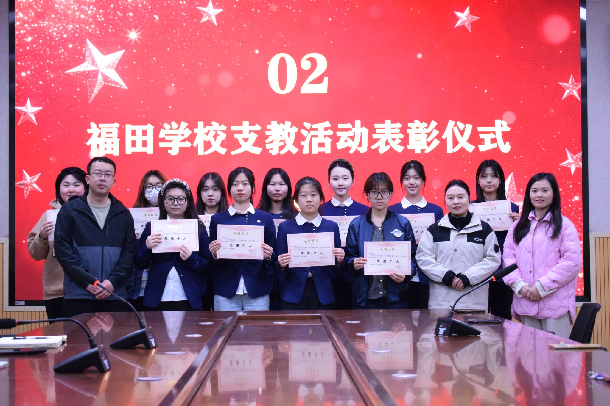 随后,叶奇奇主任对年度支教工作进行全面总结。通过生动的教学案例与珍贵的影像纪实,大会全景回顾了志愿者们趣味授课、暖心陪伴、用心育人的点滴瞬间,充分展现了校地携手、共育成长的初心坚守与责任担当。表彰环节中,福田学校高燕主任为优秀志愿者逐一颁发荣誉证书,高度赞扬全体志愿者践行“奉献、友爱、互助、进步”的志愿精神,以实际行动扎根讲台、传递温暖。